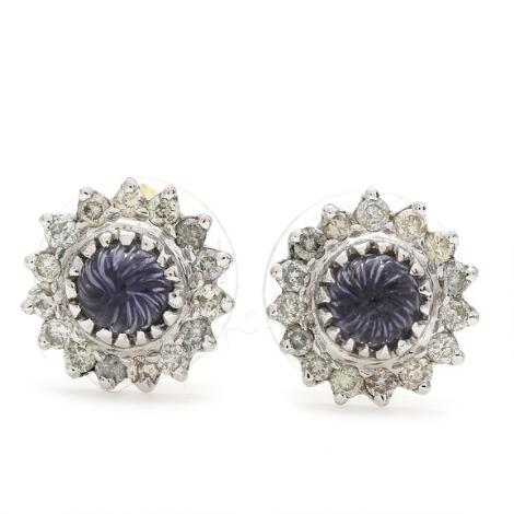 Iolit- og diamantørestikker af 8 kt. rhodineret guld prydet med cabochonslebet iolit omkranset af talrige brillantslebne diamanter. Diam. 11 mm. (2)