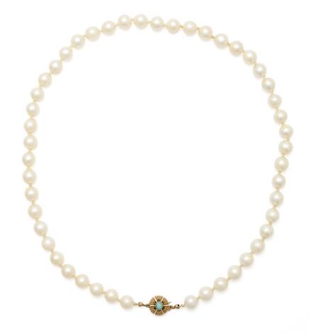 Hugo Grün: Perlehalskæde prydet med talrige perler og turkislås af 14 kt. guld. Perlediam. ca. 8 mm. L. 50,5 cm.