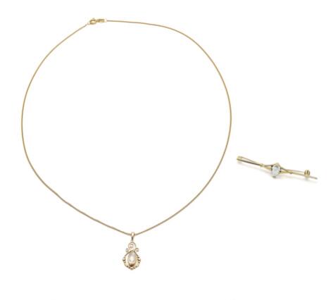 Smykkesæt af 14 og 18 kt. guld bestående af broche og vedhæng med halskæde. Samlet vægt ca. 7 g. L. 52 cm. (3)