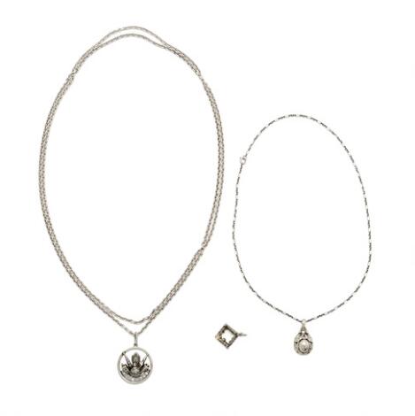Georg Jensen m.fl.: Tre vedhæng af sølv og sterlingsølv. To halskæder af sølv medfølger. L. 45-120 cm. (5)