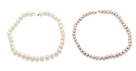 To perlehalskæder hver prydet med talrige ferskvandsperler og dubsko af sølv. Perlediam. ca. 7-10 mm. L. 42 cm. (2)