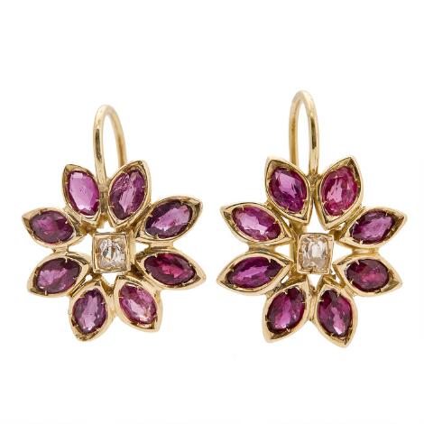 Et par rubin- og diamantørestikker af 17 kt. guld hver prydet med facetslebne rubiner og diamant. L. ca. 22 mm. (2)