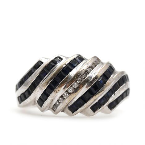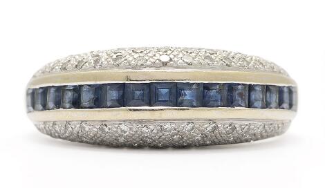 Safir- og diamantring af 18 kt. hvidguld prydet med talrige safirer og diamanter. Vægt ca. 6 g. Str. 57.