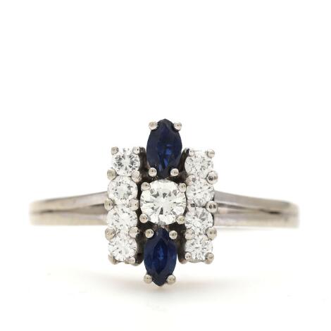 Safir- og diamantring af 18 kt. hvidguld prydet med facetslebne safirer og brillantslebne diamanter. Str. 67.