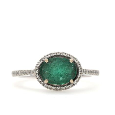 Smaragd- og diamantring af 18 kt. hvidguld prydet med smaragd på ca. 0.97 ct. omkranset af talrige diamanter. Str. 50.
