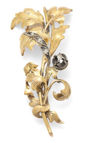 Diamantbroche af 17 kt guld og sølv prydet med old mine-cut diamanter. Vægt ca. 8,5 g. L. 5,8 cm.