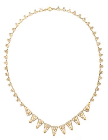 Halskæde af 18 kt. guld i forløb prydet med stiliseret bladværk. Vægt ca. 13,5 g. B. 5,5-13 mm. L. 44 cm.