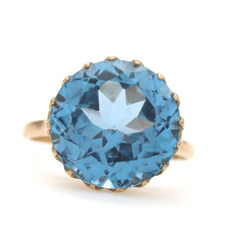 Spinelring af 14 kt. guld prydet med en syntetisk blå spinel. Str. 68.