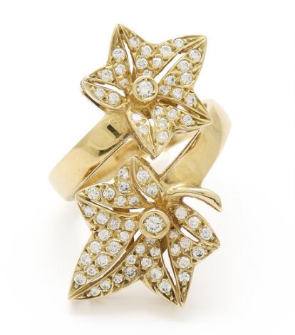 Diamantring af 18 kt. guld i form af blade prydet med brillantslebne diamanter på i alt ca. 0.50 ct. Str. ca. 53.