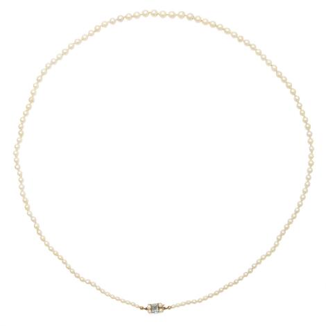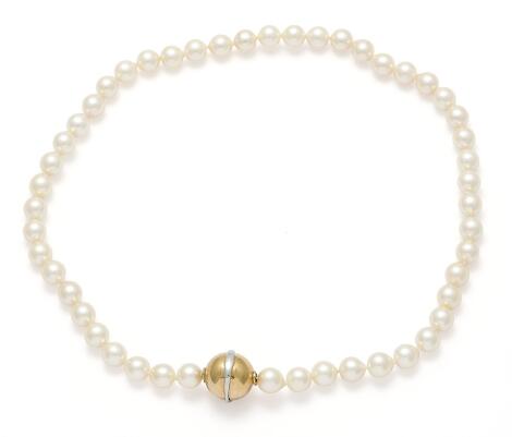 Robert Valentin Olsen: Lang perlehalskæde prydet med kulturperler og lås af 14 kt. guld. L. 75 cm.