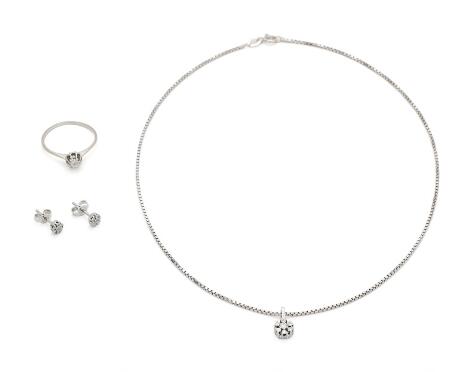 Diamantsmykkesæt af 14 kt. hvidguld bestående af et par ørestikker, ring og halskæde med vedhæng. Str. 57. (5)