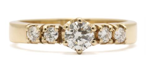 Diamantring af 14 kt. guld prydet med diamant på ca. 0.25 ct. flankeret af fire diamanter. Str. 56.