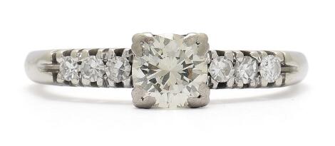 Diamantring af 18 kt. hvidguld prydet med diamant på ca. 0.57 ct. flankeret af seks diamanter. Str. 56.