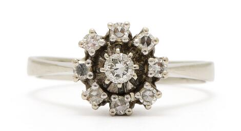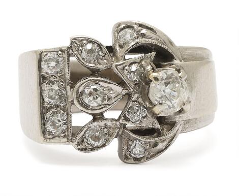 Diamantring af 14 kt. hvidguld prydet med talrige old-cut diamanter. Vægt ca. 6,5 g. B. 13 mm. Str. 51.