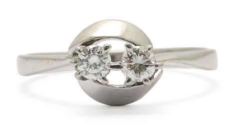 Diamantring af 14 kt. hvidguld prydet med to brillantslebne diamanter. Vægt ca. 3 g. B. 7 mm. Str. ca. 57.
