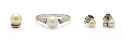 Perle- og diamantsmykkesæt af 14 kt. hvidguld bestående af et par ørestikker og ring. Str. ca. 54,5. (3)