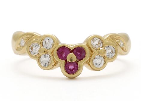 Rubin- og safirring af 18 kt. guld prydet med talrige rubiner og safirer. Vægt ca. 1,5 g. Str. 45.