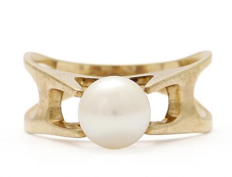 Willy Junget: Perlering af 14 kt. guld prydet med kulturperle. Vægt ca. 3,8 g. Perle diam. 7,3 mm. Str. 57,5.