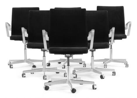 Arne Jacobsen: "Oxford". Et sæt på seks armstole med drejestel og sort alcantara. Udført hos Fritz Hansen. (6)