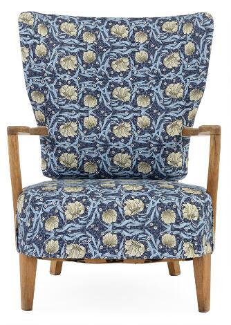 Dansk snedkermester: Lænestol af eg. Sæde og ryg betrukket med blomstret stof.