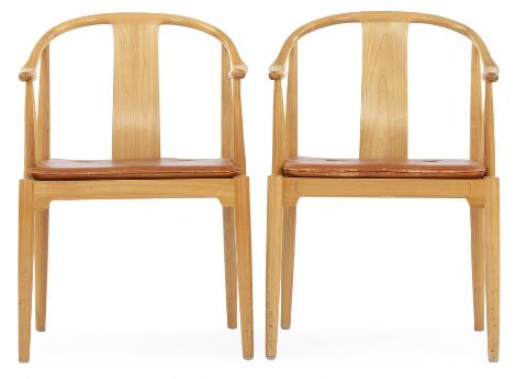 Hans J. Wegner: "Kinastolen". Et par armstole af kirsebærtræ. Sædehynde betrukket med brunt skind. (2)