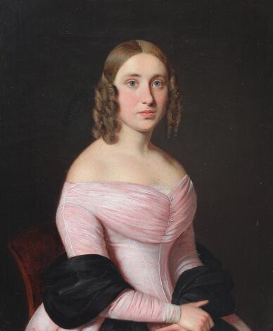 2546/73Danish painter, 19th century: Portrait of a young woman in a pink dress. Unsigned. Oil on canvas. 29 x 24 cm.
