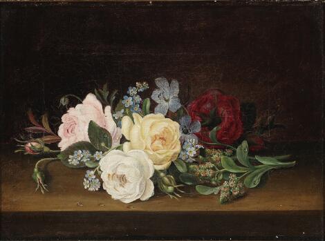 2546/199I. L. Jensen, school of, 19th century: A wreath with pink roses lying on a piece of fabric. Signed K. P. Oil on panel. 26 x 34.5 cm.