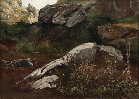 2546/13Janus la Cour: A rocky landscape with wild flowers. Unsigned. Inscribed and dated Janus la Cour 81. Oil on canvas laid on canvas. Visible size 37.5 x 52.5 cm.