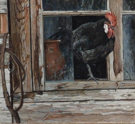 2546/55Konstantin Semenovich Vyssotsky: A rooster in a window. 1928. Signed K. Vyssotsky. Oil on canvas. 67 x 73 cm.
