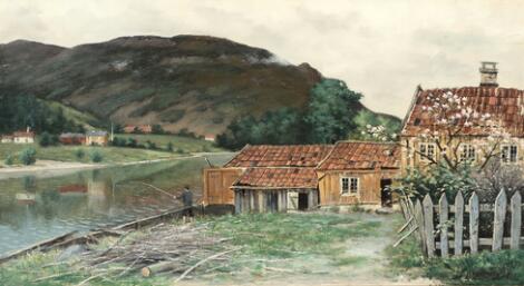2546/115Nels Hagerup: A boy fishing near his cottage at the bank of a Norwegian fiord. Signed and dated N. Hagerup 87. Oil on canvas. 35 x 63 cm.