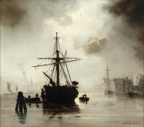 2546/19Johan-Jacob Bennetter: Vire from a harbour with sailing ships in moonlight. Signed and dated J. Bennetter 25/2 1857. Oil on canvas. 45 x 51 cm.