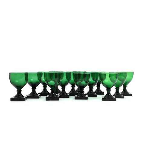 2546/108"Gorm den Gamle". 14 øl- og vinglas af mørkegrønt glas. Holmegaard. 20. årh.s begyndelse. H. ca. 12,7-12,9. (14)