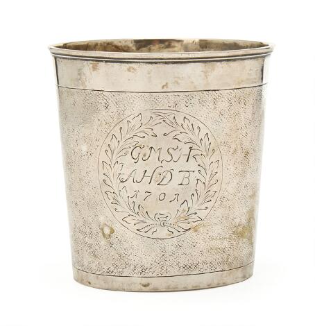 2546/93Barok bæger af sølv. Mester antagelig Christian Knudsen Smeirup, borgerskab Randers 1698. H. 8 cm.