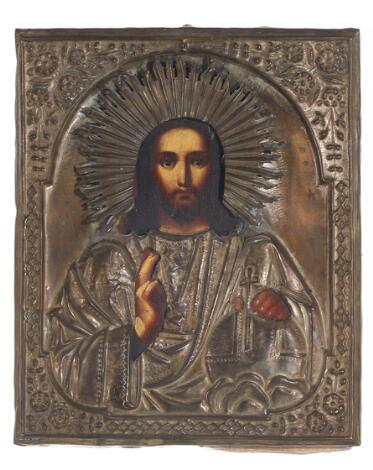 2546/92Russisk ikon med fremstilling af Jesus Pantokrator. Tempera på panel med rizza af metal. 20. årh. 32 x 27.