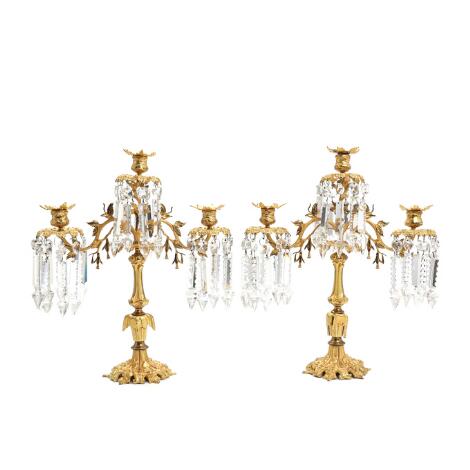 2546/138Et par trearmede kandelabre af forgyldt bronze, rigt behængt med prismer. Ca. 1900. H. 42. (2)
