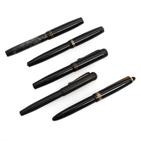 2546/1213AarhusMont Blanc, Parker, m.fl.: Fem fyldepenne af resin med pennespidser af 14 kt. guld. L. 13-14. (5)
