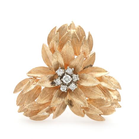 2546/1205AarhusDiamantbroche/vedhæng af satineret 14 kt. guld prydet med diamanter. Diam. 3,5 cm.