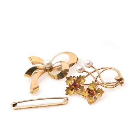 2546/1216AarhusTre brocher af henholdsvis 14 kt.- og 18 kt. guld. L. 3,5-3,8 cm. (3)