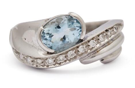2546/1195LyngbyAquamarinring af 18 kt. hvidguld prydet med ovalslebet aquamarin og brillantslebne diamanter. Str. 54.