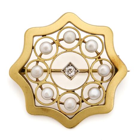 2546/1194LyngbyDiamant- og perlebroche af 18 kt. guld prydet med diamant omkranset af perler. Diam. 2,4 cm.
