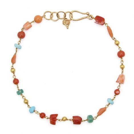 2546/1203LyngbyNatascha Trolle: Koralarmbånd af 18 kt. guld prydet med koral, turkis og smaragd samt kugler af 22 kt. guld. L. 18-19,5 cm.