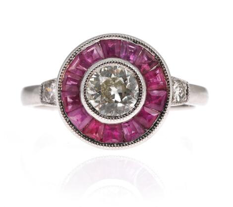 2546/1119A diamond ring set with old mine-cut diamonds and faceted rubies, mounted in 18k white gold. Size 53.5 cm.