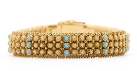 2546/1128A gold bracelet set with a garnet and turquoises, mounted in 19k gold. Weigt app. 30 g. L. 18.5 cm. Portugal. Mid 20th century.