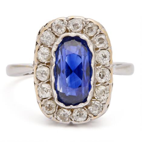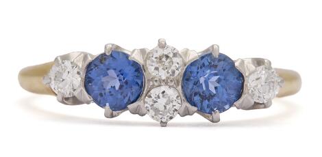 2546/1132A sapphire and diamond ring set with two sapphires and four diamonds, mounted in 18k gold and platinum. Size 50.5.