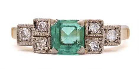 2546/1142A ring set with a fancy-cut emerald flanked by six single-cut diamonds, mounted in 18k gold and white gold. Size app. 56.5.