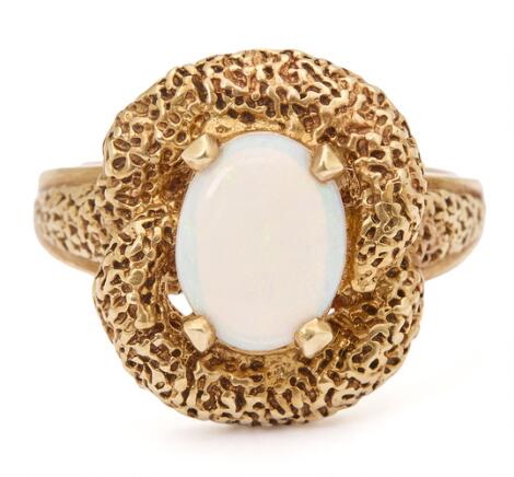 2546/1144An opal ring set with a cabochon opal, mounted in 14 gold. Weight app. 5 g. W. 15 mm. Size 52.
