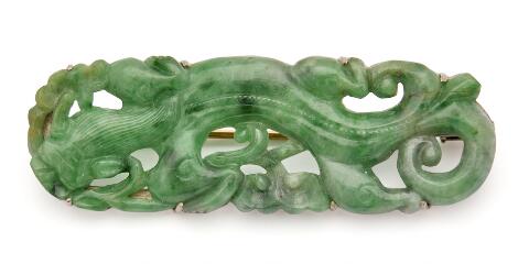 2546/1106A jade brooch set with carved jade, mounted in 18k gold. Weight app. 14 g. L. 5.5 cm.
