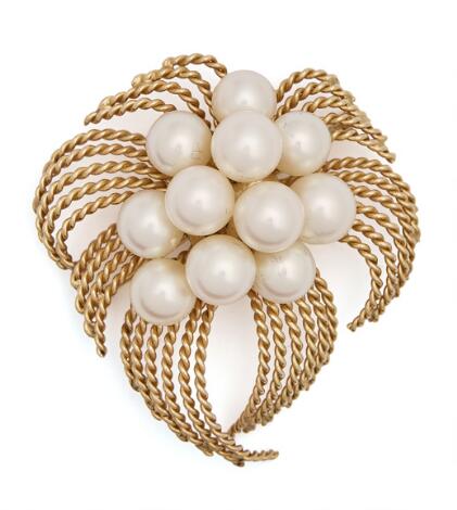 2546/1154A pearl brooch set with numerous cultured pearls, mounted in 14k rose gold. App. 4.4 x 4.8 cm.