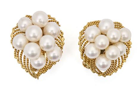 2546/1139A pair of pearl ear pendants each set with numerous cultured pearls, mounte in 14k gold. L. 24 mm. (2)