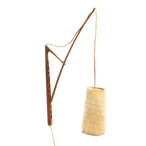 2546/914Danish design: Justérbar væglampe af patineret eg. 1950-60'erne. H. ca. 75-85 cm.